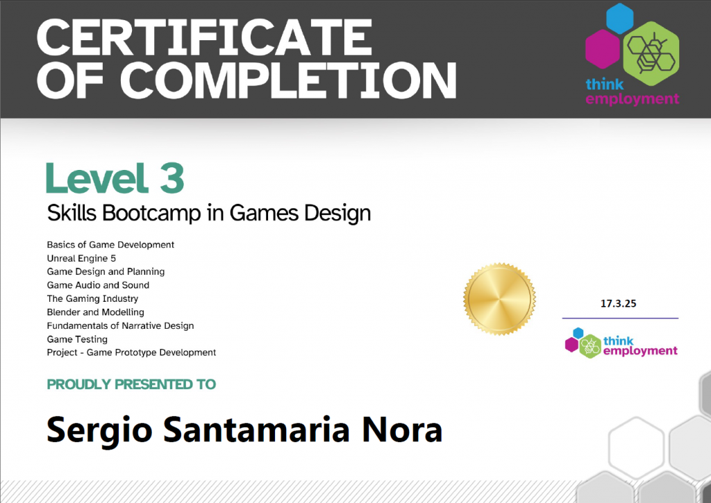Hi everyone, I completed a Bootcamp in Game Design by the platform Think Employment. This bootcamp is focused on using Unreal Engine 5, Blender 3D and Audacity, my main objective is to finish a playable Prototype using that software.